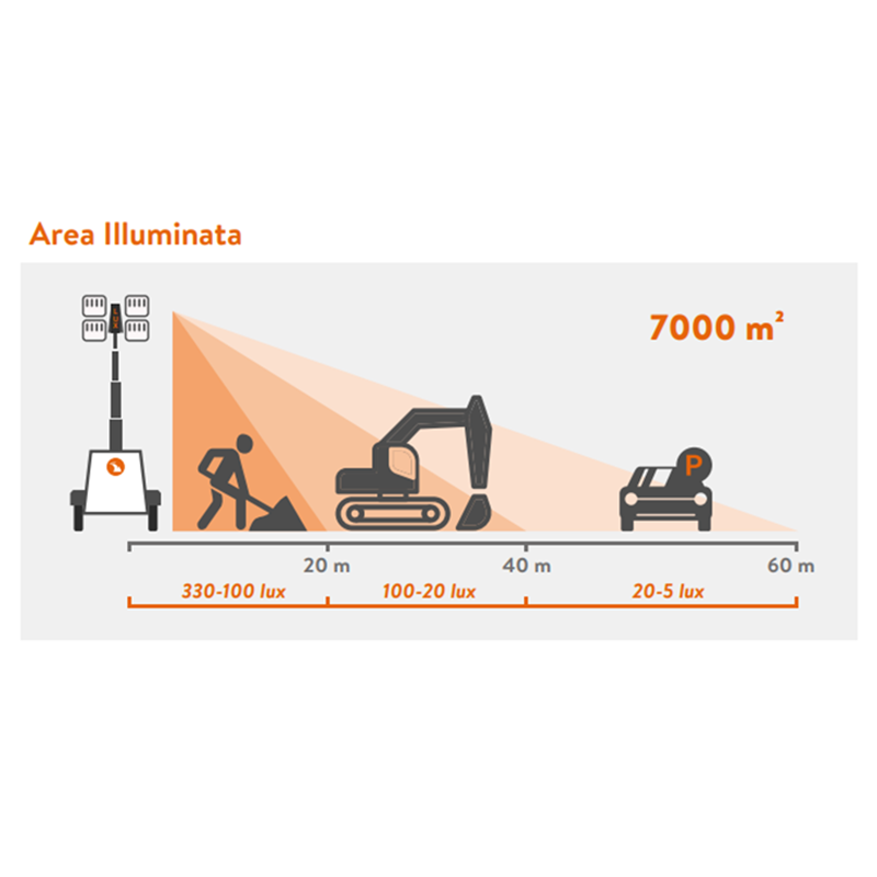 LUXTOWER LUX M12 è una torre faro compatta e facilmente trasportabile che può illuminare efficacemente aree fino a 7000 mq con un impatto ambientale ridotto.
