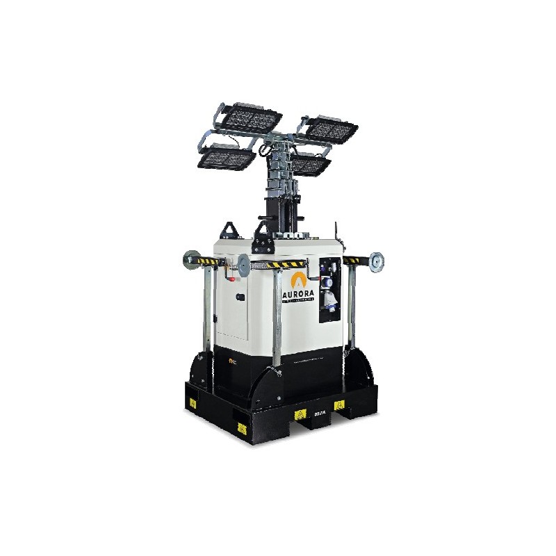 AURORA DELTA L6X160 è dotato di una torre di sollevamento in acciaio zincato capace di estendersi fino a 8,5 metri di altezza massima, compresa di 4 piedi di stabilizzazione per assicurare la torre faro una volta aperta.