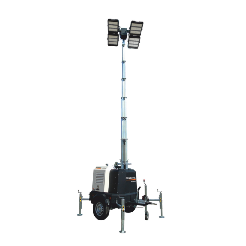 GENERAC LT V20 è una torre faro mobile equipaggiata con quattro proiettori LED da 320W che possono essere sollevati fino ad un'altezza di 8.5 m, capace di illuminare un'area di 4500 m2.