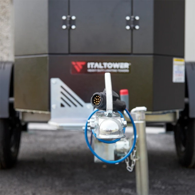 Il carrello di trasporto omologato integrato nella struttura della torre faro, permette di trasportarla o rilocarla in modo semplicissimo. La compattezza e la resistenza di questa torre fare la rendono ideale per un utilizzo in zone con estreme condizioni climatiche. La torre di illuminazione è progettata per essere facilmente trasportabile, grazie alla sua struttura robusta ma leggera e alla presenza di ruote per il trasporto. È anche facile da installare