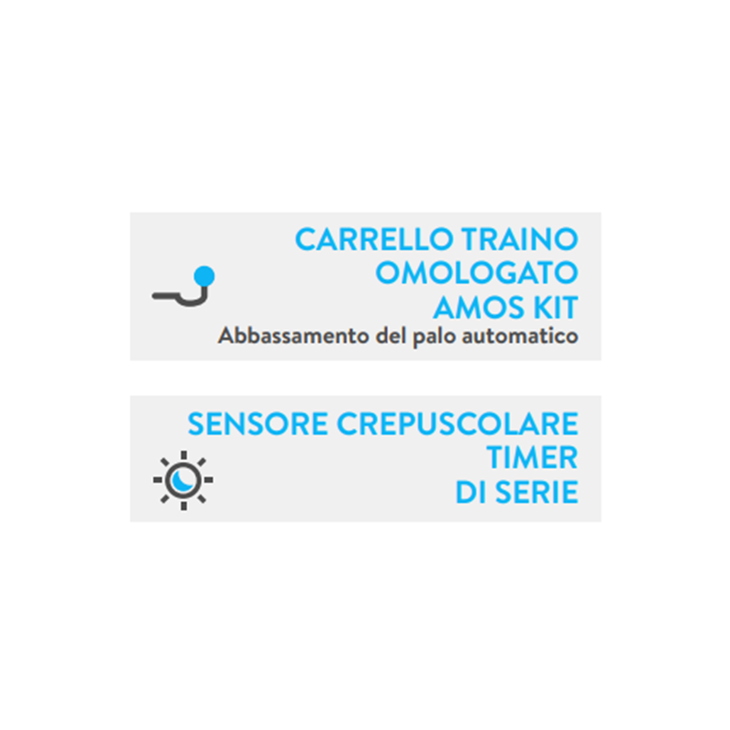 Equipaggiata con sensore crepuscolare, timer e sistema di abbassamento automatico del palo (AMOS KIT), la LUXTOWER LUX Hybrid Lithium Traino Veloce è progettata per una gestione smart e completamente automatizzata.
