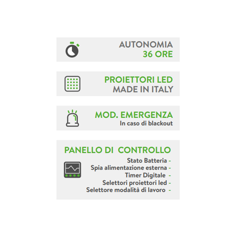 Grazie al pacco batterie AGM (6V DC - 400Ah), la LUXTOWER LUX C23Battery Torre Faro LED 4x100W assicura un’autonomia fino a 36 ore senza necessità di ricarica.