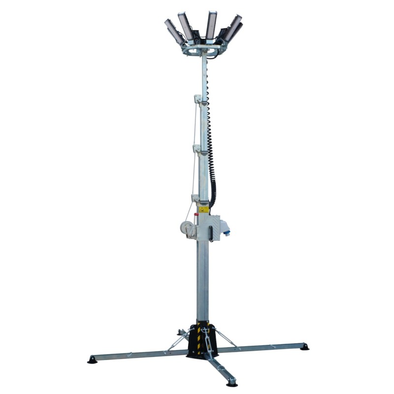 Italtower ITALTOWER MT360° EVO SKID-S Torre Faro 8x50W è progettata con struttura stazionaria su skid e 4 stabilizzatori per una posa rapida e una stabilità elevata in opera. Italtower ITALTOWER MT360° EVO SKID-S Torre Faro 8x50W monta un palo zincato con altezza massima 5,5 m, sistema di elevazione manuale e resistenza aerodinamica fino a 80 km/h, caratteristiche che la rendono adatta anche a impieghi outdoor prolungati.