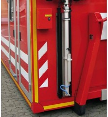 Il fermo di sicurezza arresta la discesa ad un’altezza di sicurezza che evita il rischio di urti con i proiettori durante la normale fase discesa o in caso di rottura improvvisa delle funi telescopico o del freno automatico dell’arganello di sollevamento. Grazie al peso contenuto e all'allestimento su carrello di traino manuale, può essere manovrata con facilità da un unico operatore.